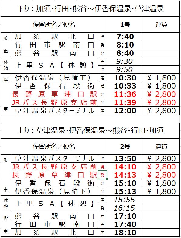 ゆめぐり埼玉号に停留所「長野原草津口駅」および「JRバス長野原支店前」の2カ所を増設致します。